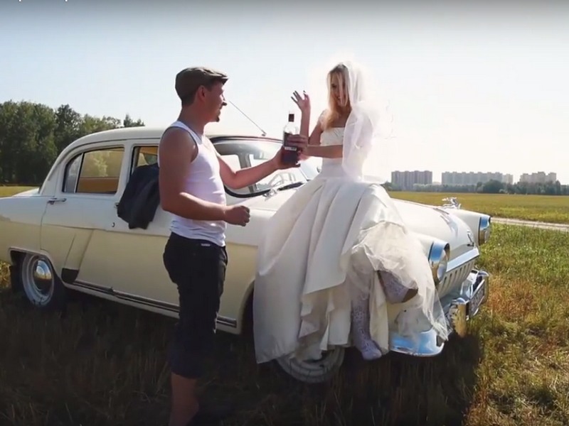 Сбежавшая из загса невеста пьет алкогольный суррогат в клипе на песню «Волга 21» новосибирской группы «Рви Меха — Оркестр».