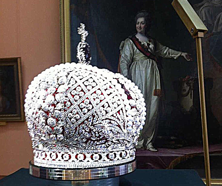 Короной российской империи короновались все императоры России, начиная с Екатерины Великой. Благодаря двухкилограммовому украшению вокруг царской головы сиял нимб святости. Православный царь должен был ассоциироваться у подданных с живой иконой. После убийства последнего русского царя корону забрали в музей, но ненадолго. Большевики заложили ее иностранцам для своих большевистских нужд. Теперь святыня напоминает о былом величии, находясь под семью запорами в Москве, в Алмазном фонде РФ, куда так просто не попасть. "В советское время корону охранял батальон милиции из 30 человек, сейчас этим занимается частное охранное предприятие из 120 специалистов плюс двести видеокамер", – пояснил Вячеслав Раевский, но о хитростях охраны реплики распространяться не стал.