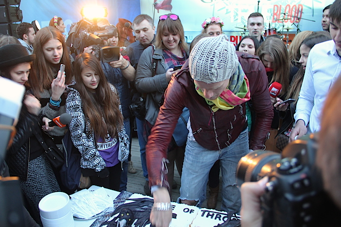 В завершение вечера на сцену вынесли огромный торт с трехглазым вороном и надписью «Game of Thrones». «Птичку жалко», - посетовал Колокольников, но все-таки разделал пернатого.