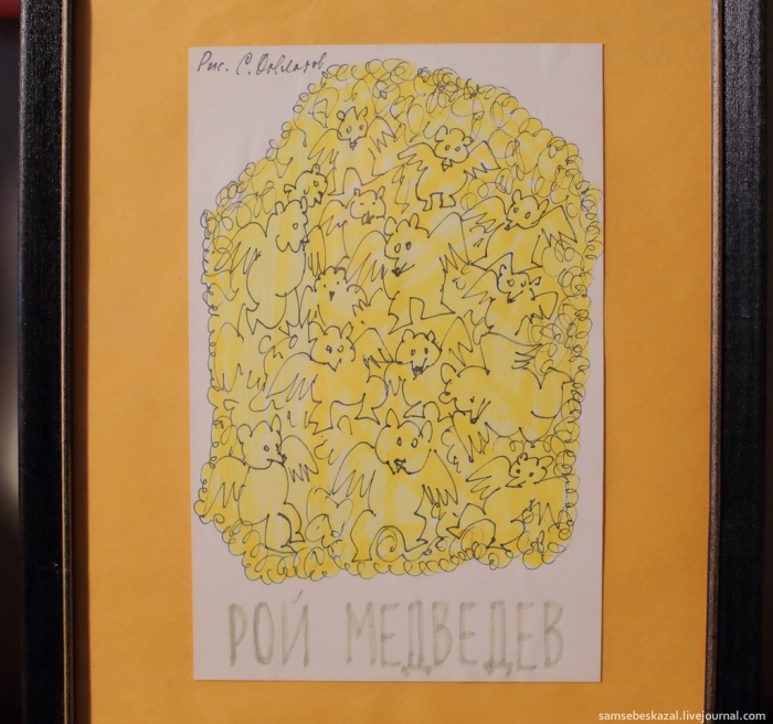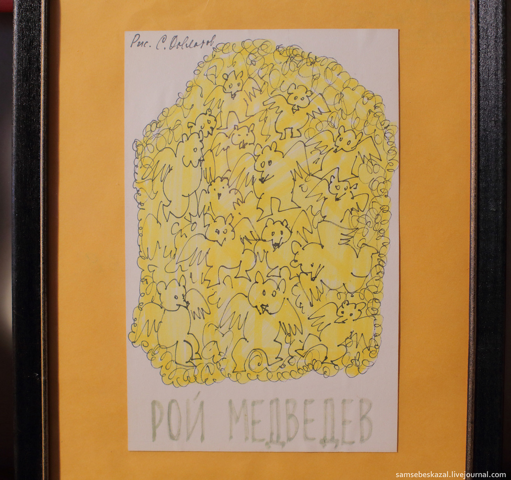 Довлатов любил украшать свое рабочее место всякими дорогими ему мелочами. Прямом над столом висит огромный портрет супруги Лены, которую он сам снял и увеличил потом снимок. Фотография молодой Норы, еще одна ее фотография с любимой собакой Глашей, шутливая картинка с названием "Рой медведев", иллюстрация к русскому Плейбою, шарж на Гришу Поляка, карикатура на Ленина. За два года до смерти на стене появился запечатанный желтый конверт с завещанием.