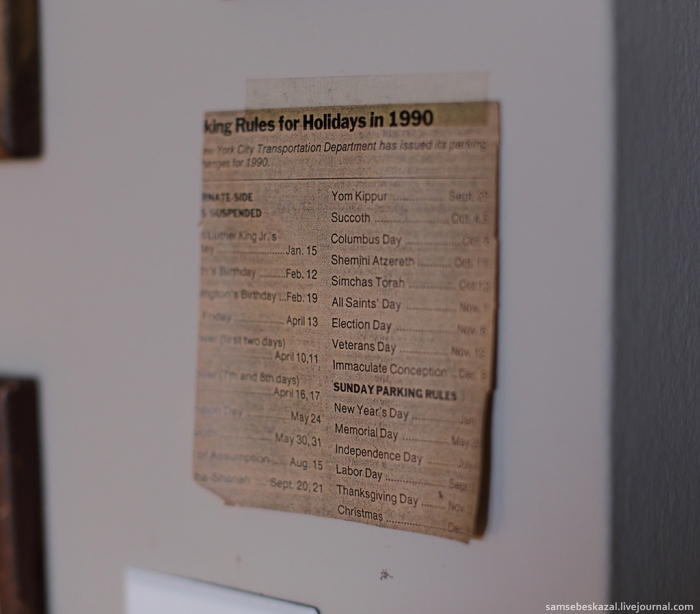 На стене висят пожелтевшие уже от времени правила парковки в Нью-Йорке на праздничные дни 1990 года.