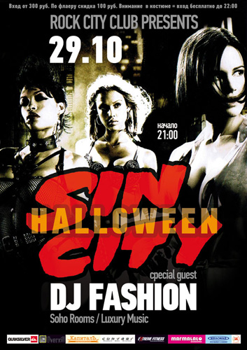 29 октября там празднуют Хэллоуин с помощью другой алкогольной компании. Клуб Rock City представляют HALLOWEEN "Город Грехов"! Жители и нежители: 100%. Гостей ждет костюмированное шоу, специальный гость Специальный гость DJ FASHION, и, вероятно, предвкушение праздника. Стоимость входных билетов от 300 руб. По флаеру скидка 100 руб. В костюме - вход бесплатно до 22-00.