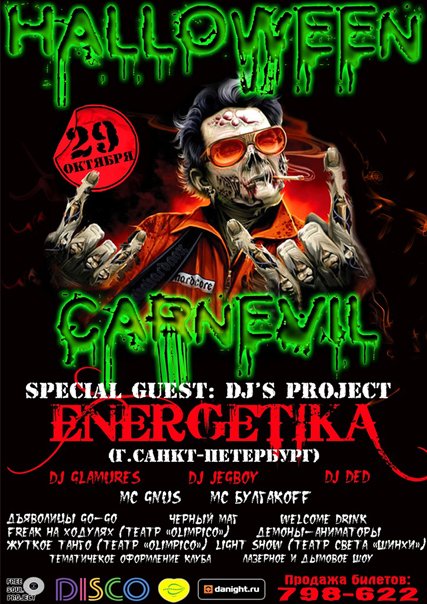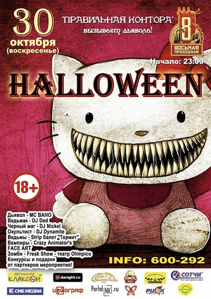 29 октября начать жить страшной и активной клубной жизнью можно будет в клубе Disco. Для вас будет играть поистине страшное количество ди-джеев, а пугать вас будут лазерным и дымовым шоу. Начало мероприятия в 23-30, билеты – от 100 рублей. 30, слегка отдышавшись, можно отправиться на вечеринку в Ресторан-Экспозицию "8-я Проходная". Там решили вызвать дьявола. Развлекать в процессе вызова сам будут ведьмаки и ведьмы. Вампиры и прочая пляшущая нечисть. Вход – от 200 рублей. Внимание – 18+!