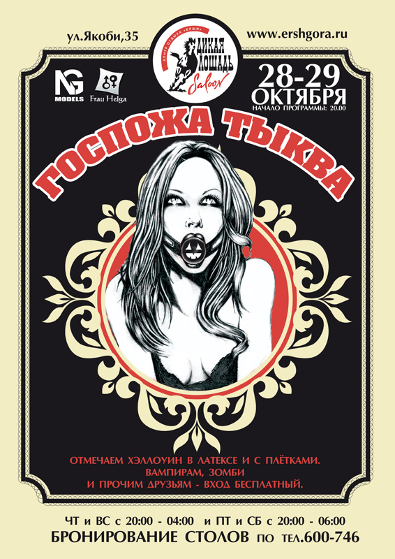 Начать отмечать заморскую ночь творения можно будет с 29 октября в ночном клубе Panorama. Вас будет развлекать привычный уже завсегдатаям шоу-балет "Панорама", правда, наряженный в тематические костюмы. Антураж, атмосфера – все, для того, чтобы люди почувствовали приближение ужаса понедельника. Начало в 22-00, вход 250 рублей. Так же 29 истомленные ожиданием могут сходить на вечеринку "Госпожа Тыква" в клуб "Дикая лошадь". Это действительно страшно – в программе БДСМ-шоу, сексуальный интерактив от NG Models и ВИА "Ерш-Бэнд". Стоимость билета – 300 рублей. В костюмах – вход бесплатный.